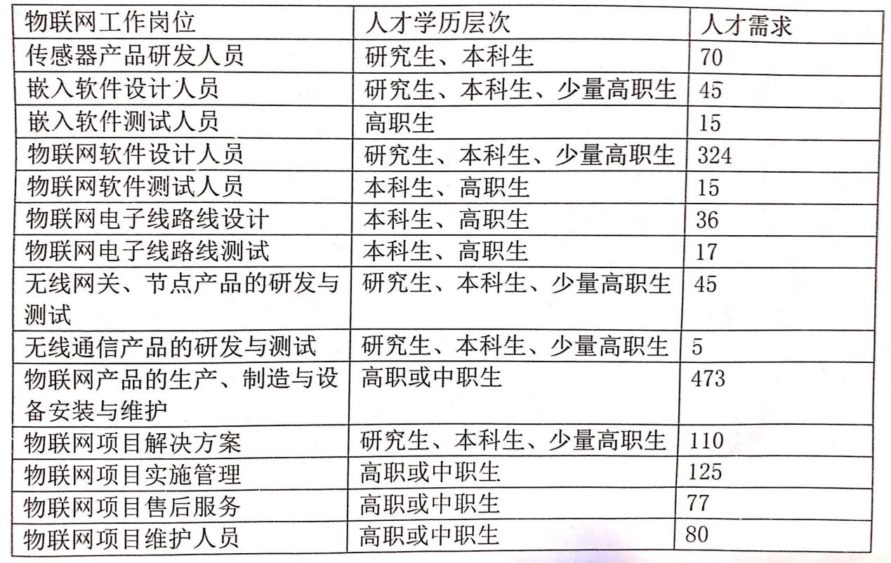 调研结果显示,物联网企业对中、高职层次人才主要需求为:电子产品生产技术员、物联网软件程序员、物联网软件测试员、物联网工程项目技术员、网络维护技术员、物联网系统管理员、物联网应用系统管理员、物联网设备安装与维护、软件营销与技术支持人员等。