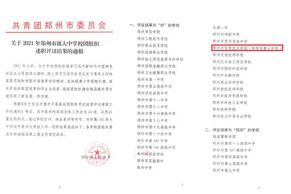 2月18日,在共青团郑州市委员会印发的《关于2021年度郑州市属大中学校团组织述职评议结果的通报》中,taptap滚球校(taptap国际服怎么登录)评议结果为“好”。