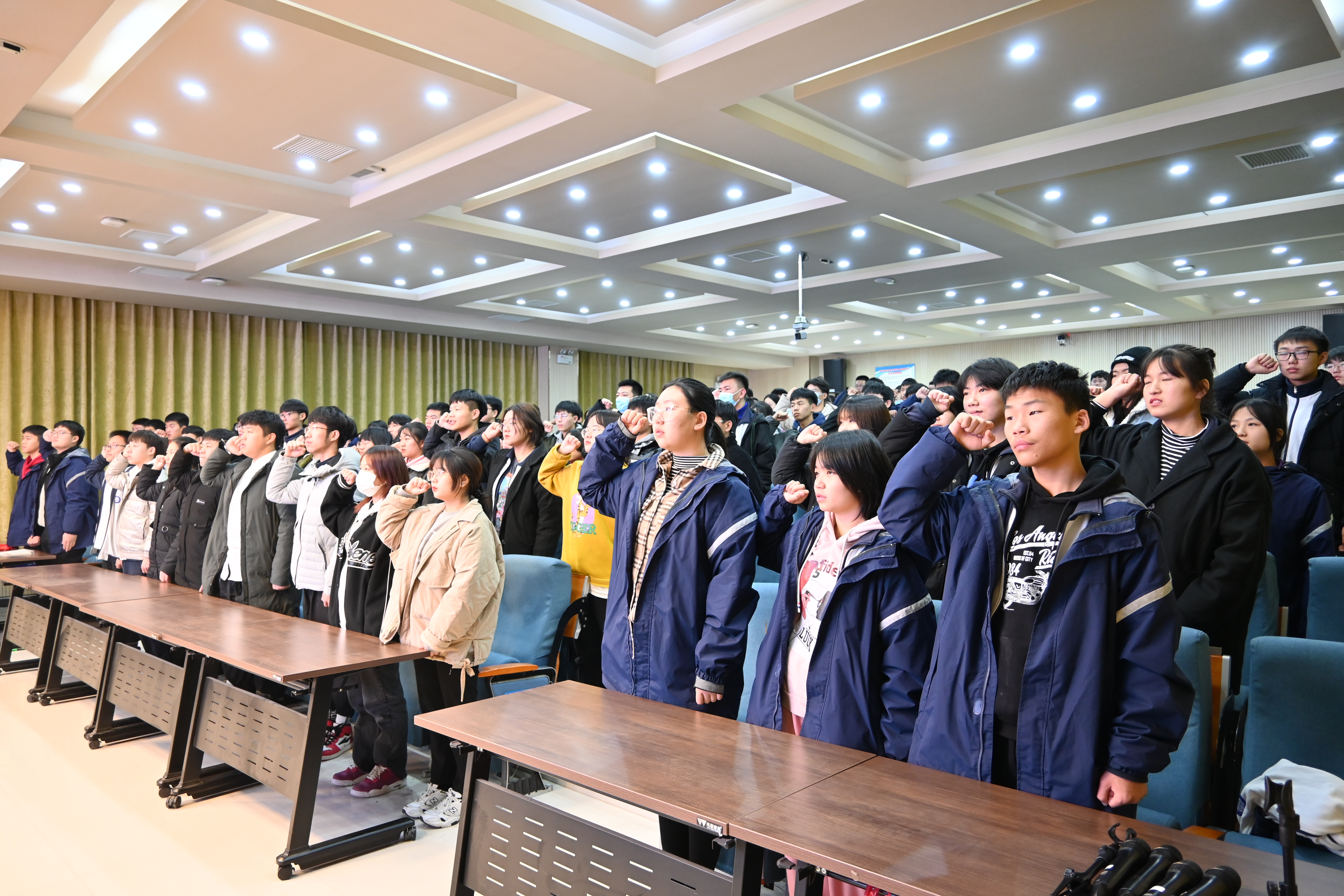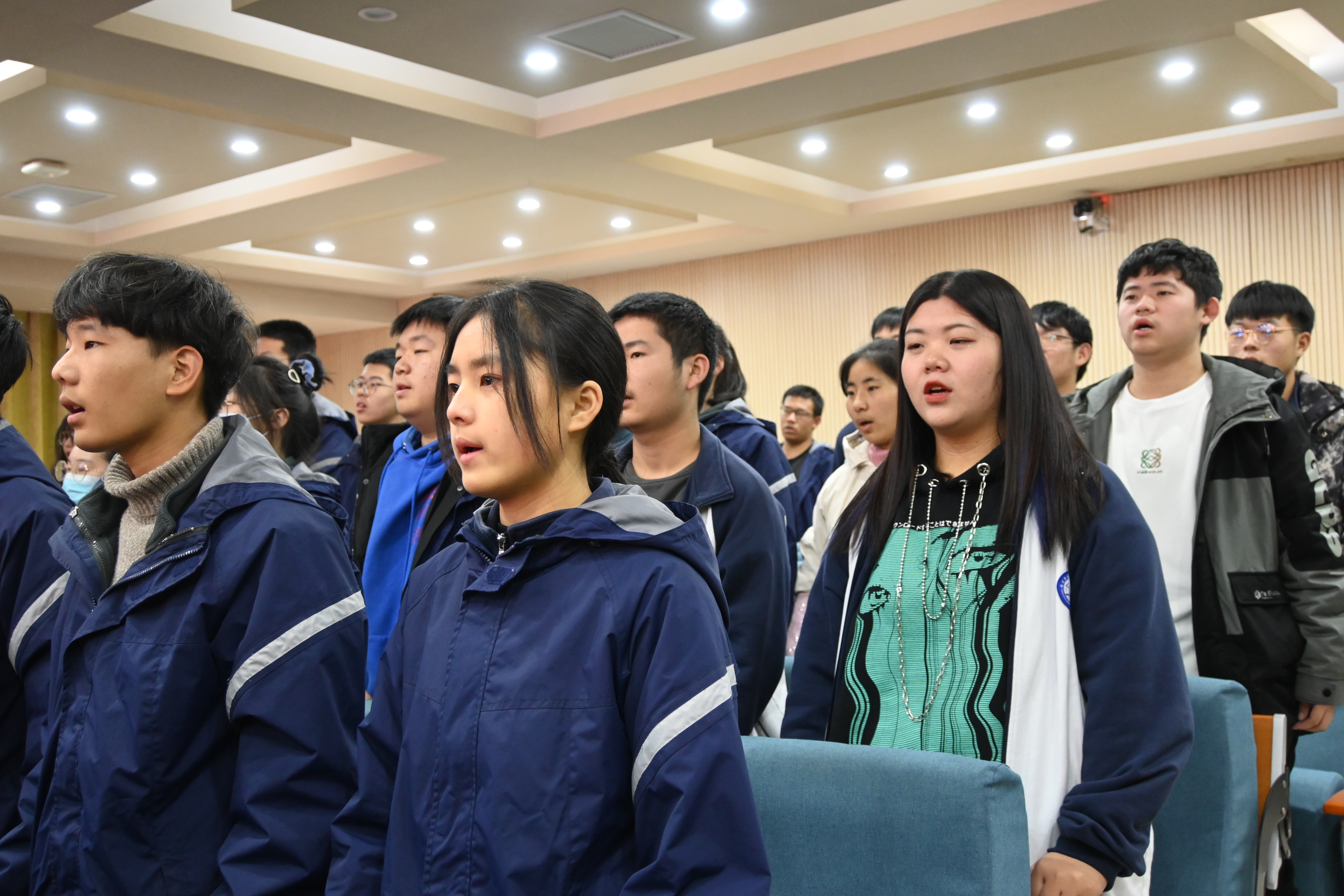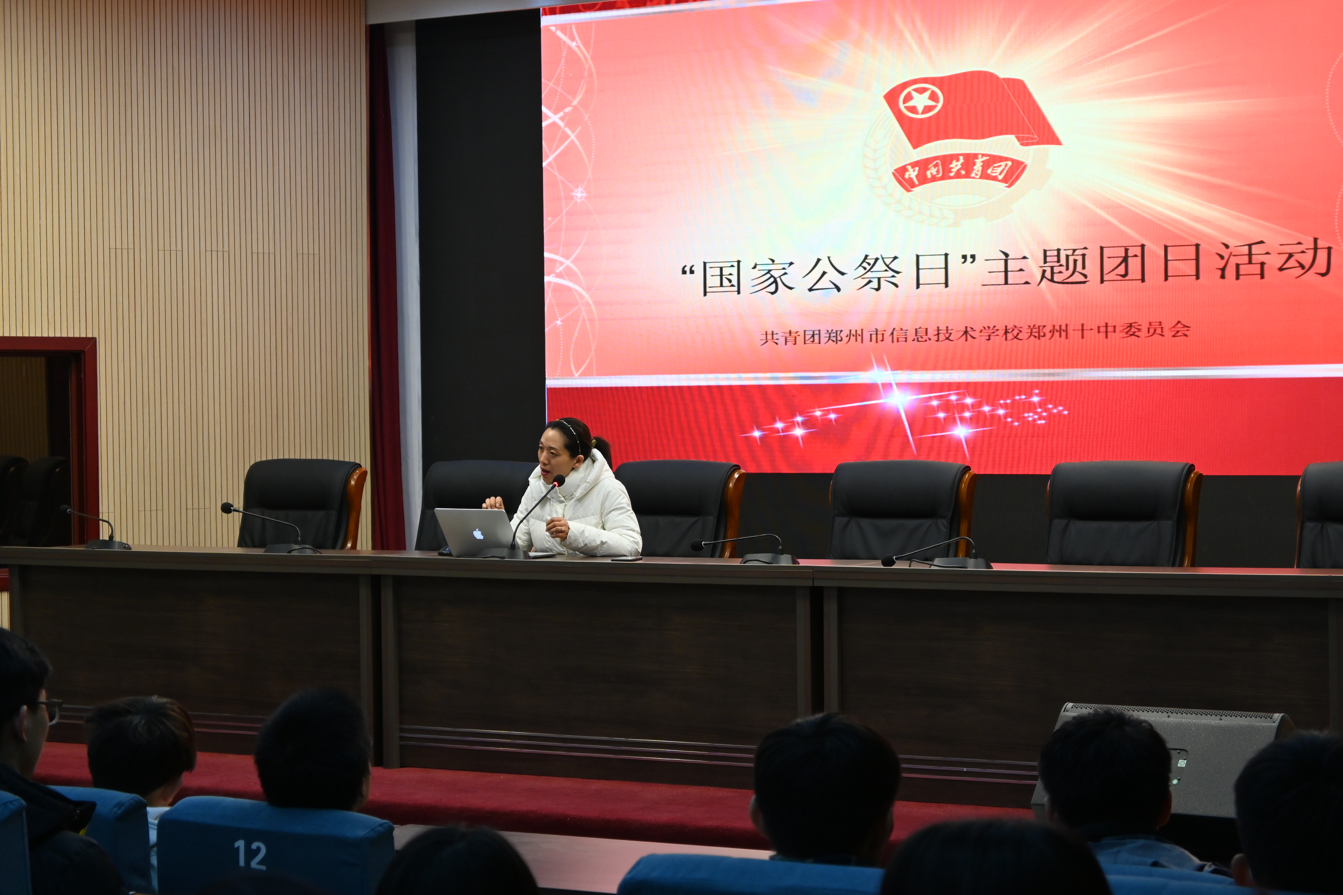 活动在庄严响亮的团歌声拉开序幕。校团委副书记李晓培对在座的全体成员进行爱国主义教育,向同学们展示相关档案图片和真实视频资料,带领同学们了解了那段血泪历史和国家公祭日的由来及意义。全体与会成员低首肃立,为南京大屠杀遇难同胞默哀一分钟。而后,李晓培为同学们介绍了当前的全球局势,引用习主席寄语来告诫大家:忘记历史就意味着背叛,否认罪责就意味着重犯。她说到,我们不应因一个民族中有少数军国主义分子发起侵略战争就仇视这个民族。和平像阳光一样温暖、像雨露一样滋润。有了阳光雨露,万物才能茁壮成长。有了和平稳定,人类才能更好实现自己的梦想。最后,李晓培带领全体同学重温了入团誓词。