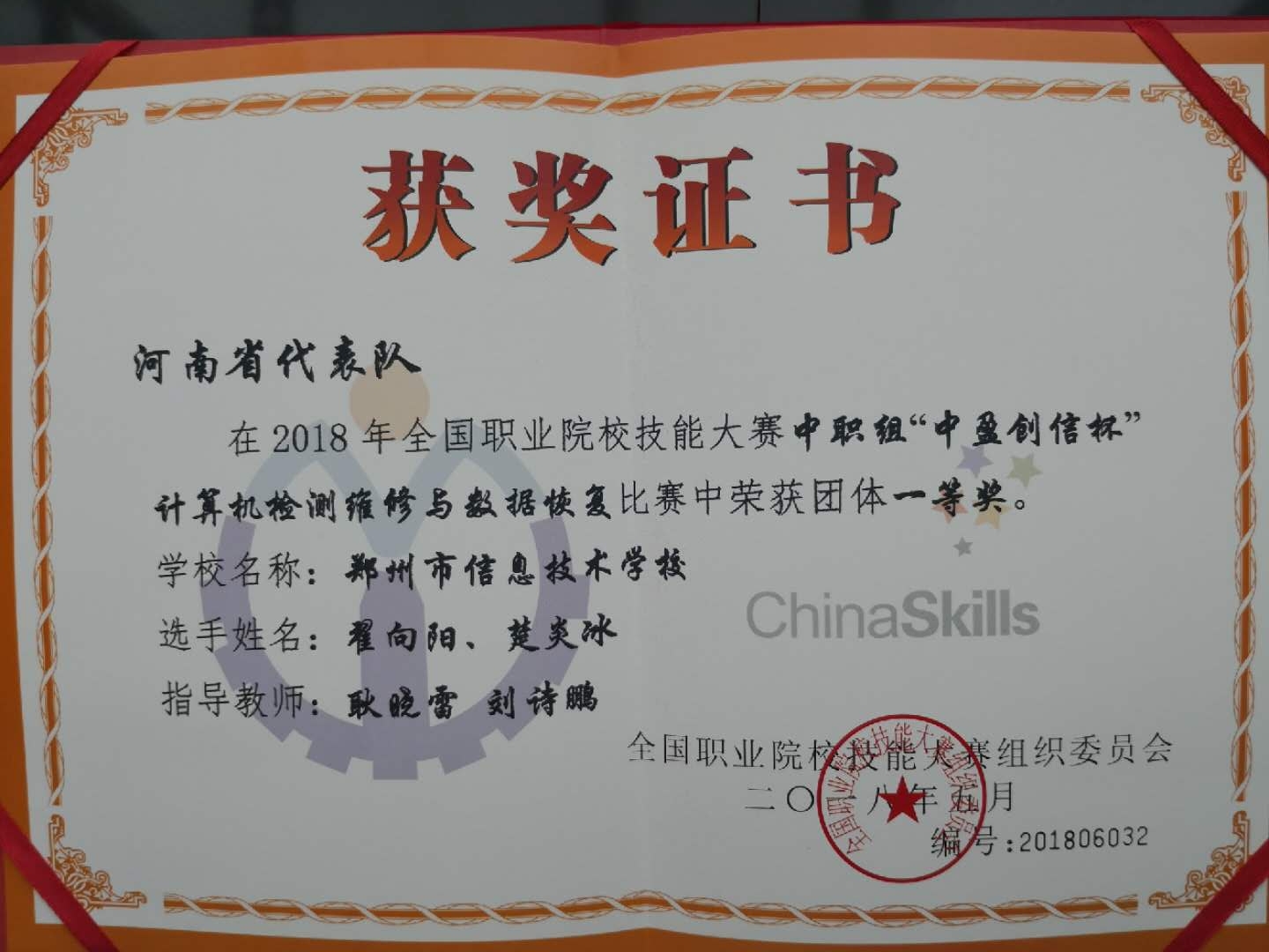 2016年计算机检测维修与数据恢复一等奖获奖证书