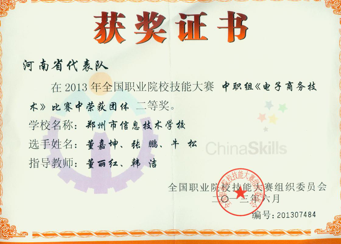 2013年电子商务技术二等奖获奖证书