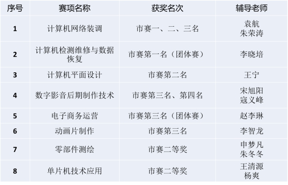 在今年10月举行的河南省中等职业学校技能竞赛活动中,学校共参加计算机网络装调、动画片制作、广告平面设计、数字影视后期制作、计算机检测维修与数据恢复、零部件测量与绘图等6个赛项成绩优异,共斩获10金1银。在郑州市第二十六届中等职业学校技能竞赛中,我校在11个赛项中共收获一等奖8项,二等奖若干,其中计算机网络装调赛项我校参赛4名选手,分别获得一等奖第一、二、三名,计算机检测维修与数据恢复赛项学生发挥稳定稳居市赛第一名,电子商务技能竞赛我校也有了实质性突破,获得90.60分,位居第三名。
