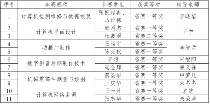 序号 | 参赛赛项 | 参赛学生 | 获奖等次 | 辅导教师 |