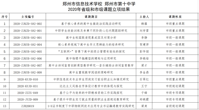 2017年和2019年我校计算机平面设计和计算机应用(物联网技术应用方向)顺利通过郑州市第一批和第三批重点专业建设项目验收,2020年11月,郑州市教育局开展了新一轮品牌专业建设工作,我校计算机平面设计和计算机应用两大重点专业接受郑州市评估组检查并获得了专家组的好评。计算机平面设计专业也积极构建国际学术交流平台,植入引进高端课程。2020年8月,我校与中欧国际设计文化协会深度洽谈,并达成一致目标,于2020年11中下旬通过协会植入引进高端课程《创意性思维方法》。