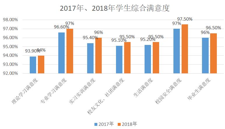 学校注重建设校园文化环境的建设和文化积淀,从激发学生的学习兴趣、增强学生学习信心、构建多样课余生活等方面来丰富学生的学习生活体验,其中学生理论学习满意度为94%,专业学习满意度为97%,实习实训满意度为96%,校园文化与社团活动满意度为95.5%,生活满意度为95.5%,校园安全满意度为97.5%,毕业生对学校满意度为96.5%。