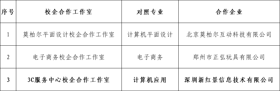 学校自2018年2月搬入新校区后,分别建立了3个校企合作工作室,分别为“莫柏尔平面设计校企合作工作室”、“电子商务校企合作工作室”、“3C服务中心校企合作工作室”,其中计算机应用专业校内实训基地是与深圳新红景信息技术有限公司联合创办,旨在培养物联网技术专业学生在硬件维修、产品焊接等方面的技术。校内3个校企合作工作室的建立,能够使校内实训更加便利,使学校的创新创业教育落到实处,能够充分利用校内资源,助力就业创业工作的开展。