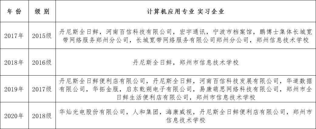学校计算机应用专业与上海企想信息技术有限公司、丹尼斯全日鲜,河南百信科技有限公司,宏宇通讯,宁波市档案馆,鹏博士集体长城宽带网络服务郑州分公司,长城宽带网络服务有限公司郑州分公司等企业签订了长期的校企合作和实习实训协议,学生定期进入岗位实践。以下为2015级、2016级、2017级、2018级计算机应用专业学生到企业实践一览表。