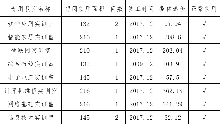 作为市级重点专业,计算机应用专业的专业设施和经费投入得到充分保障,先后建成了计算机应用专业实训室2个、智能家居实训室1个、物联网实训室1个、综合布线实训室1个、电工电子实训室1个、计算机维修实训室1个、网络基础实训室1个、信息技术实训室2个,设备总价值为1300余万元。实训室设备先进,数量充足,教学设备的使用率为100%,实训场所和工位数完全能够满足学生需要;每班教室都配有多媒体教学设备,能使老师和学生及时上网学习和查阅资料。学校还建有3C产品校企合作实训基地,充分满足校外实训要求。