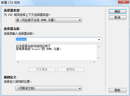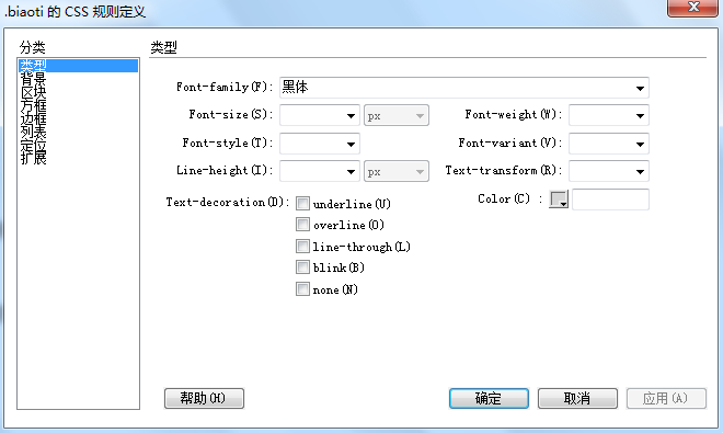 - 在“ CSS样式”中双击“.biaoti”样式,打“.biaoti的CSS规则定义”对话框,如图3-19所示。