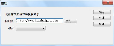 (1)单击如图3-3所示列表中的“基础”按钮,弹出“基础”对话框。在Herf文本框中输入基础URL地址,在“目标”下拉列表中选择链接页面在哪个框架集中打开,其中包括5个选项,指定所有链接的文档应在哪个框架或窗口中打开。如图3-11所示。