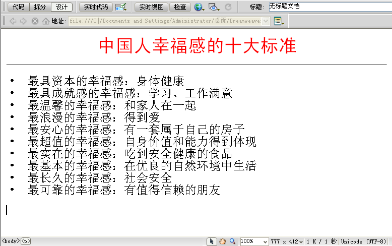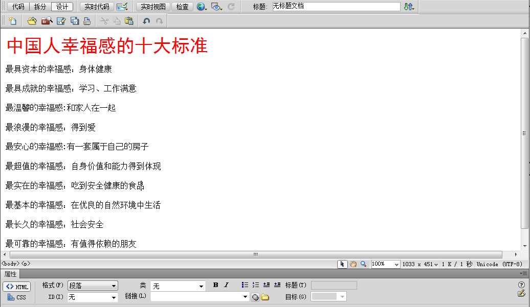 在文档窗口中输入“中国人幸福感的十大标准”,每输入一行,直接按回车键换行,输入文本后的效果如图3-13所示。
