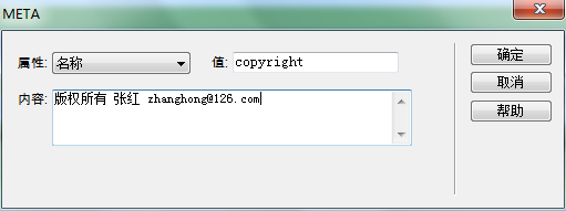(3)如果希望设置版权声明,在“值”文本框中输入copyright,在“内容”文本框中输入版权声明,如图3-5如示。