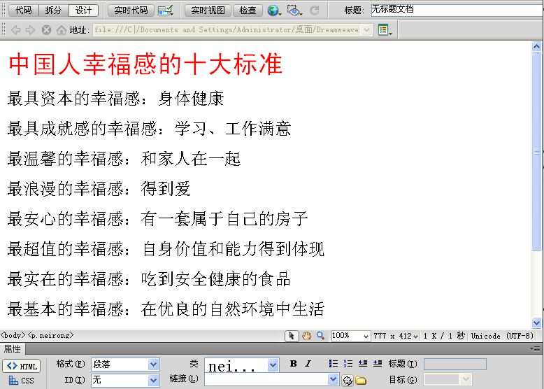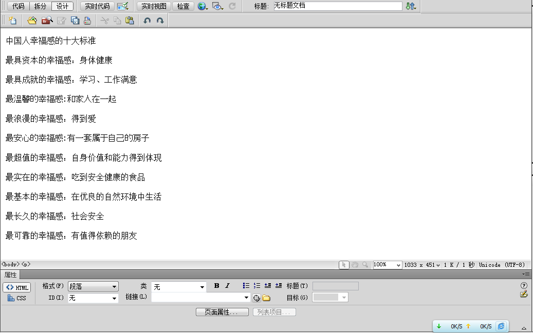 说明:Dreamweaver中普通文本的输入与其他文字处理软件基本一样,有以下两种方式。