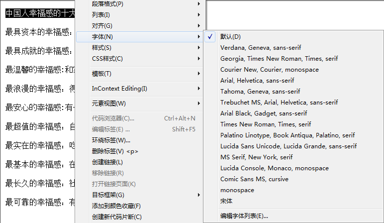 选择文本标题,右击,选择“字体”->“编辑字体列表”,如图3-15所示。