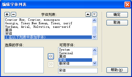 按钮将字体类型移动到“选择的字体”框后,单击字体列表的“加号”按钮,将选中的字体类型添加到字体列表中,如图3-16所示。同样可以单击“右移”
