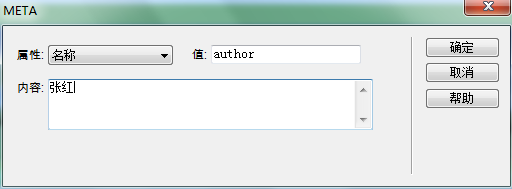 (2)以定义作者信息为例,在“属性”栏中选择“名称”属性,在“值”文本框中输入值为author,在“内容”文本框中输入作者“张红”,即作者信息。如图3-4所示。