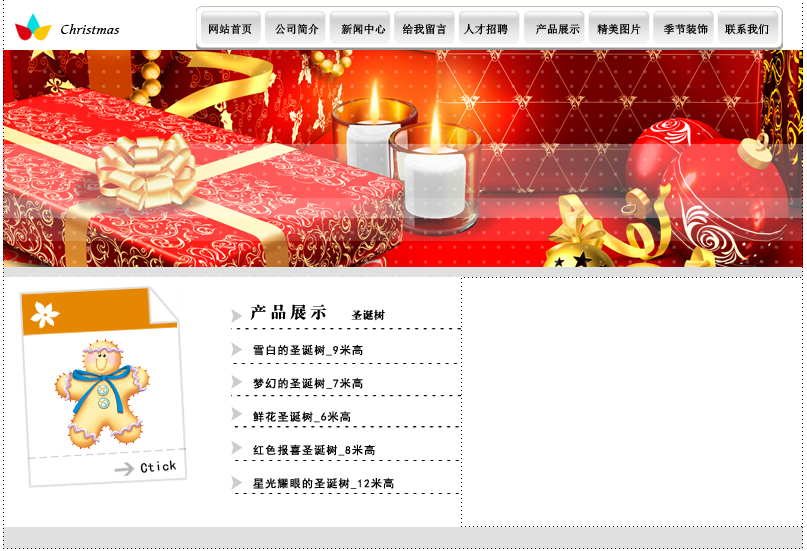 【需求分析】:本例是为圣诞装饰公司制作的网页,主要是对圣诞树不同规格产品的介绍,吸引人们关注和购买圣诞装饰品。
