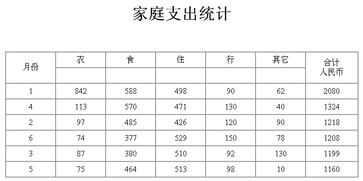 【需求分析】对于一个新组成的年青家庭,每月在衣食住行还有娱乐等方面有着不小的开销,如果不清楚自己的消费着重点,有可能会入不敷出,成为月光族。为此我们设计一个家庭月支出统计表,直观分析每个月的消费大方向