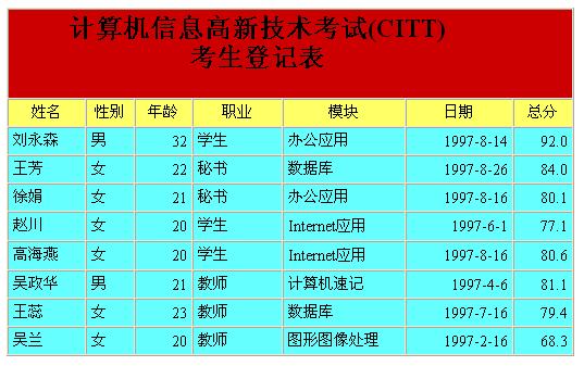 3、作业:在网上设置一个“考生登记表”(如图6.13),主要是根据表格属性和单元格属性来设置表格的外观。