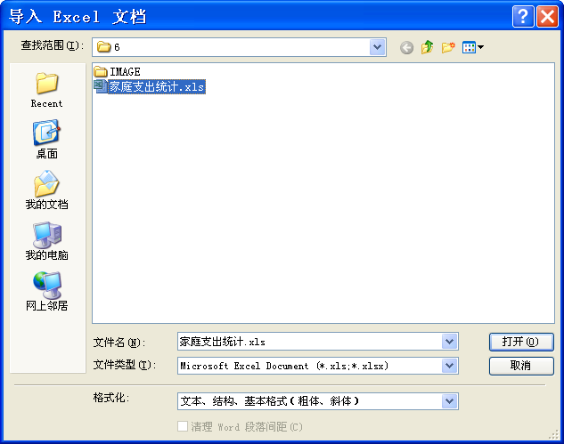 步骤3:按<Enter>键换行,从“文件”菜单中选择“导入”命令,然后选择“Excel文档”,导入“家庭支出统计.xls”文件,如图6.25所示,这样Excel表格就被导入到页面中了。