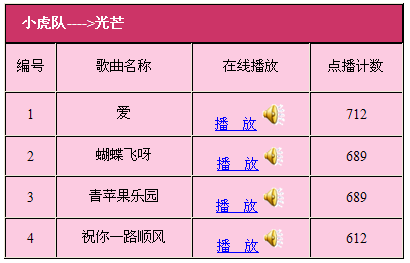 3、作业:小虎队由三个年轻男孩组成,他们的歌曲具有阳光向上的特点,一直以来经常在网上点播。现为这些好歌设计一个点播排行榜