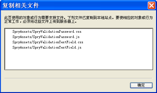 步骤11:保存文件,按F12浏览时会出现Spry对象自动生成的JS和CSS文件,如图7.37所示的窗口,单击确定。输入信息后,确认验证效果是否满足题目要求。