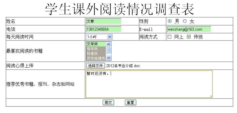 课外阅读既可以巩固学生课内阅读的成果又可以扩大阅读领域,提高阅读能力,锻炼其思维,陶冶其品德,也是开拓学生视野、发展学生智力的重要途径之一。我们关注中学生课外阅读的现状,设置了一个“课外阅读情况调查问卷”网页,从而能够精确分析学生的课外阅读情况。