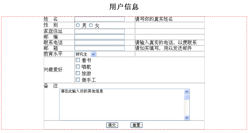 本案例的表单元素包括文本域、隐藏域、复选框、列表、文本域以及按钮等。为了使表单中对象排版美观,我们需要在表单中插入表格进行排版。