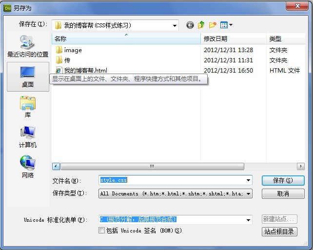 (2) 在Dreamweaver CS5菜单栏中选择“文件”—>”新建”,在打开的“新建文档”中,选择“空白页”的“CSS”,点击“创建”按钮,将复制的代码粘贴到新建的CSS页面文件中,并保存到站点文件夹中,如图8-4和图8-5所示。
