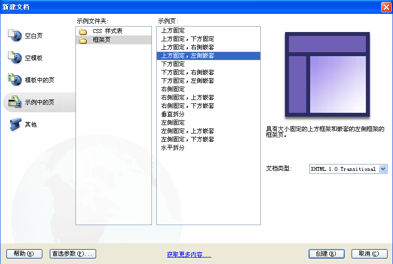 - 选择【示例中的页】->【框架页】->【上方固定,左方嵌套】选项,如图9-1所示。